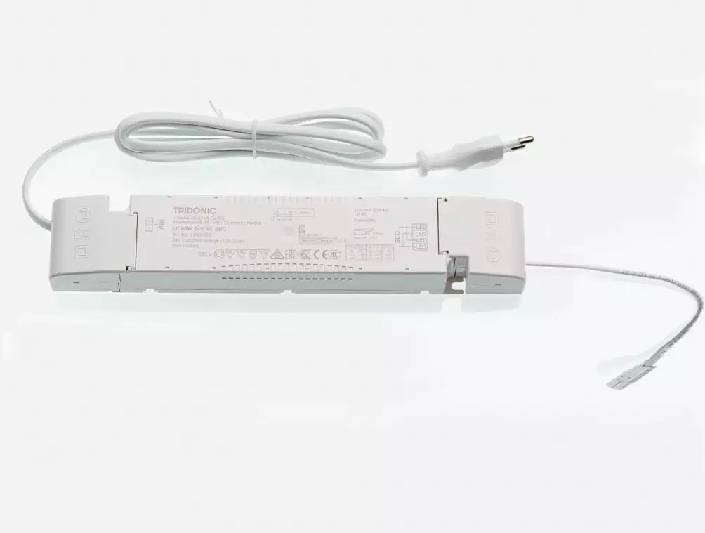 Dreamled Tridonic liitäntälaite 60W/24V CV, valaistuksen mitoitus 12,5W max. 4,8 m, 14,4 W max.4,1 m. Sisältää 24V heikkovirtajohdon pikaliittimellä sekä 230V liitosjohdon (pituus 1,5 m) eurotulpalla. Heikkovirtaliitokset Phoenix-pikaliittimillä. Takuu 5 vuotta.
